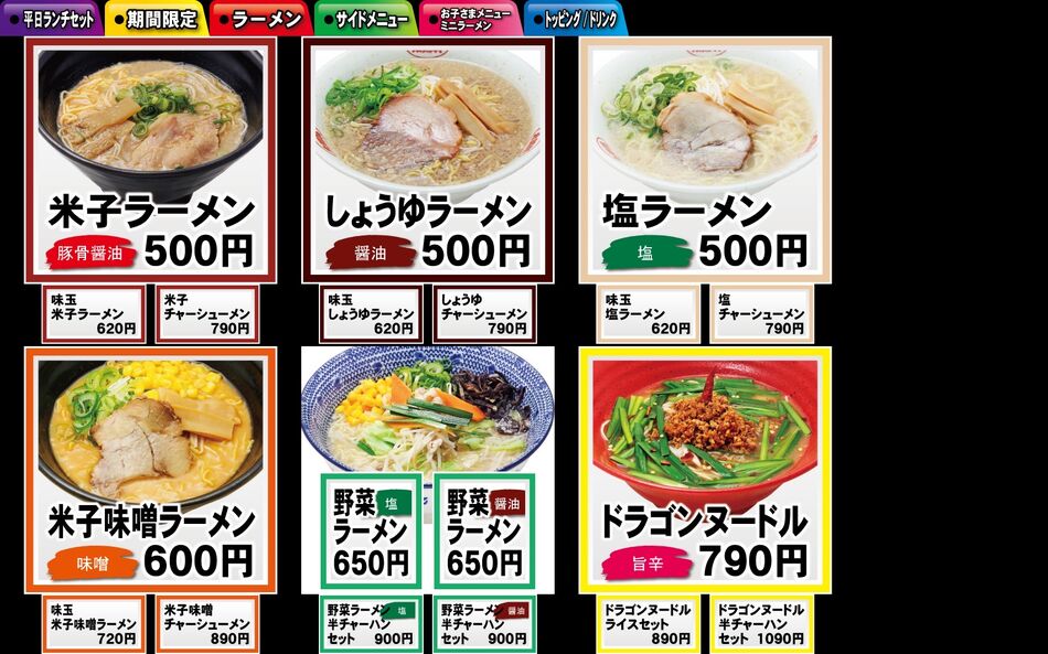 500円のリーズナブルなメニューから大人気の野菜ラーメン、ドラゴンヌードルも通常メニューであります!